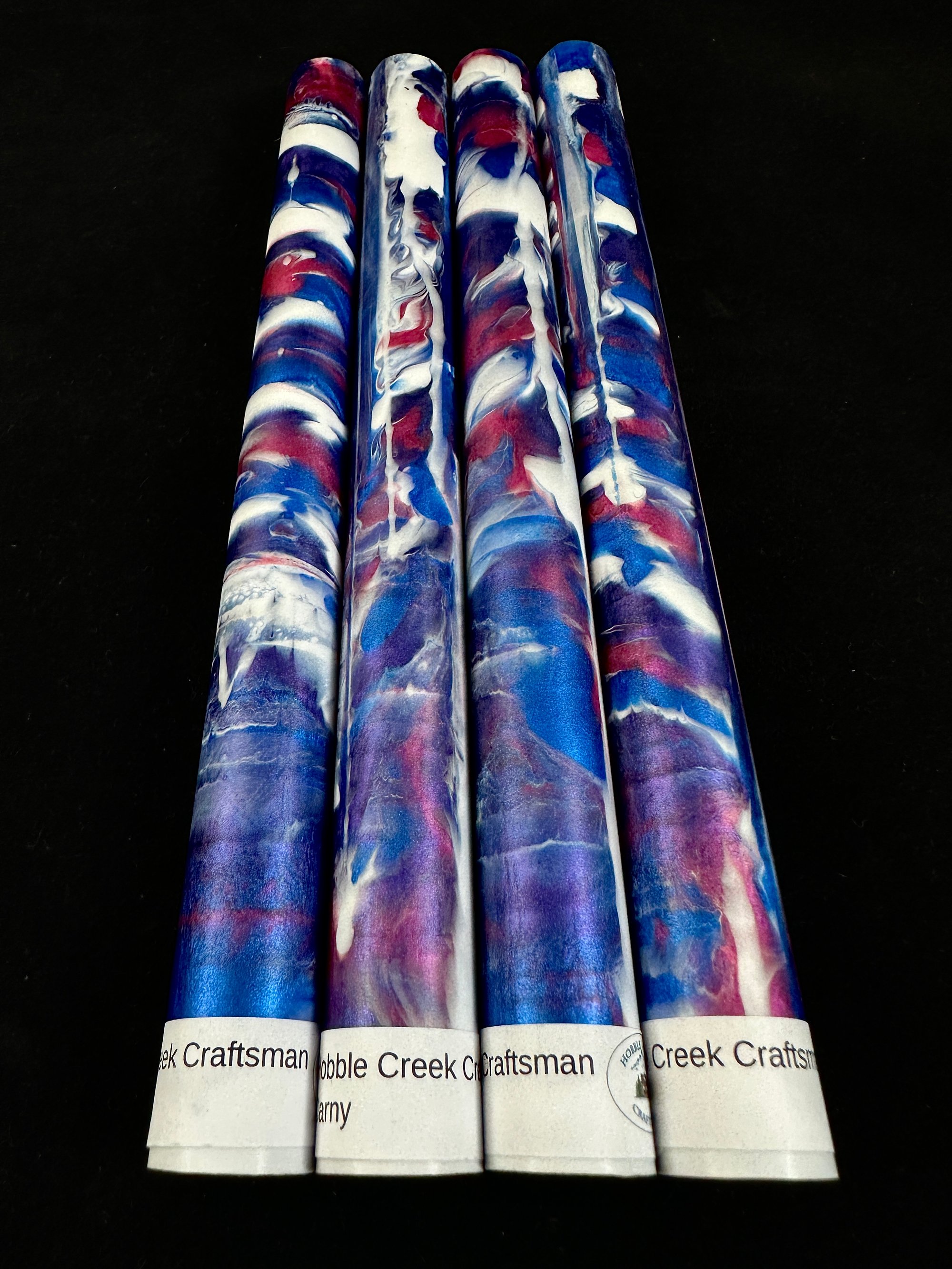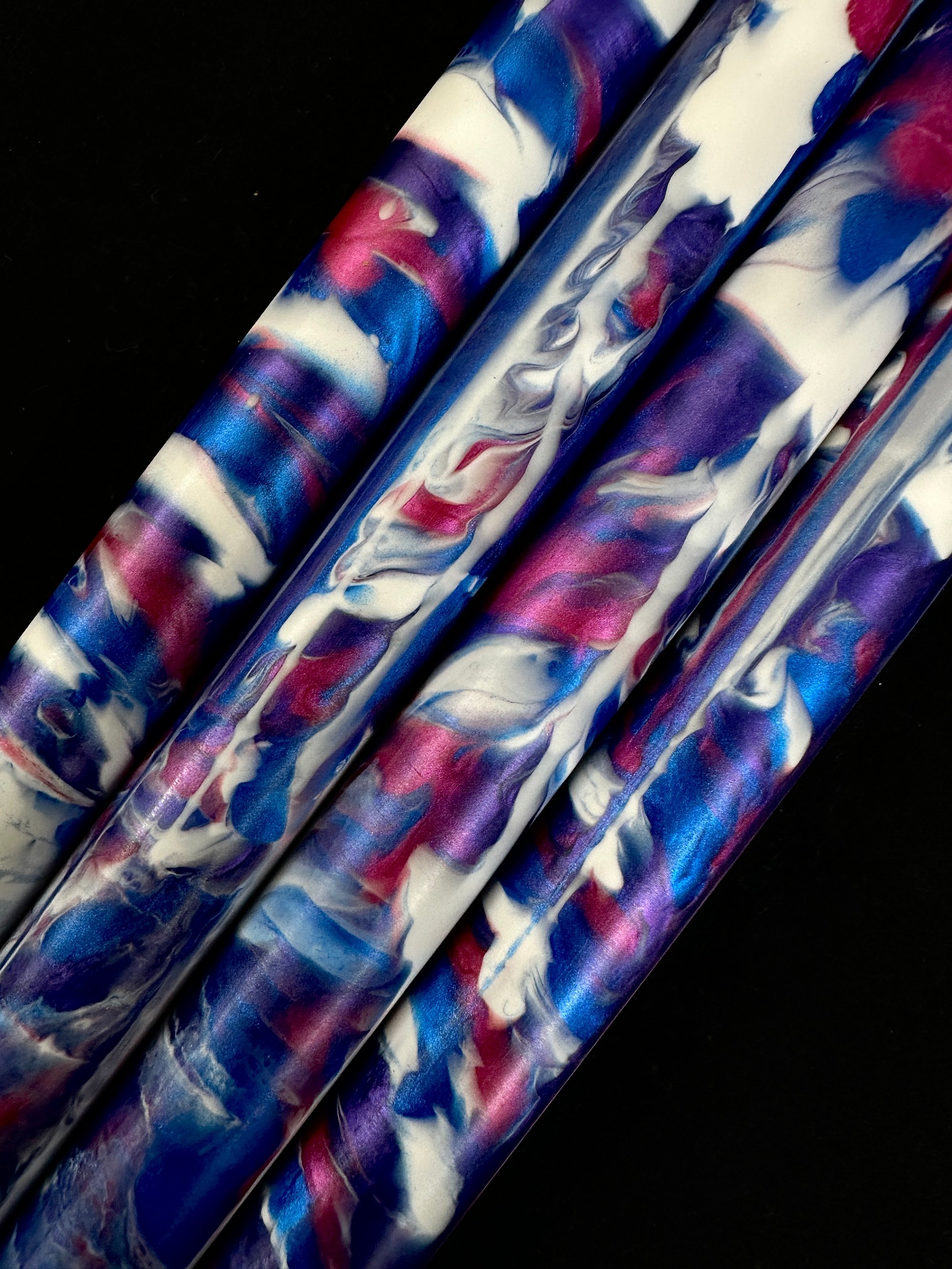 Premium, one of a kind custom bespoke pen blanks. High pressure cast and cured with Alumilite Resin® and unique blends of Eye Candy® mica pigments. 'Carny' includes shades of purple, blue, pink and opaque white. Made in small batches. These are exclusive, top of the line blanks we offer to custom pen makers. Perfect for the high end fountain pen maker, but would also look fantastic on a kit pen.