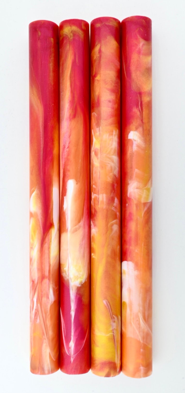 Premium, one of a kind pen blanks. High pressure cast and cured with Alumilite Resin® and unique blends of Eye Candy® mica pigments. 'Desert Sunset' is full of colors reminiscent of a Southwest Sunset. Made in small batches. These are exclusive, top of the line blanks we offer to custom makers. Perfect for the high end fountain pen Maker or any other custom Maker of fine handmade crafts.