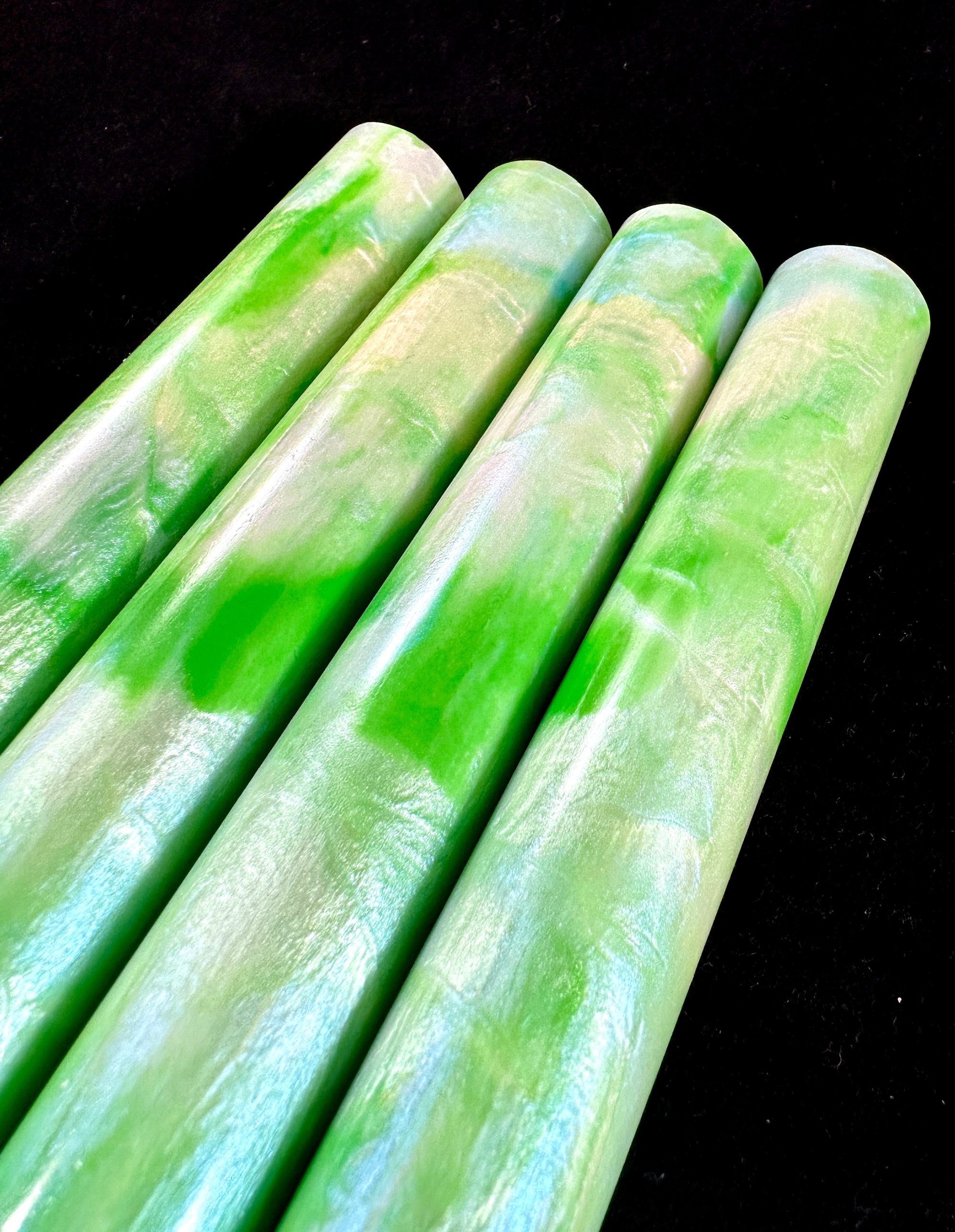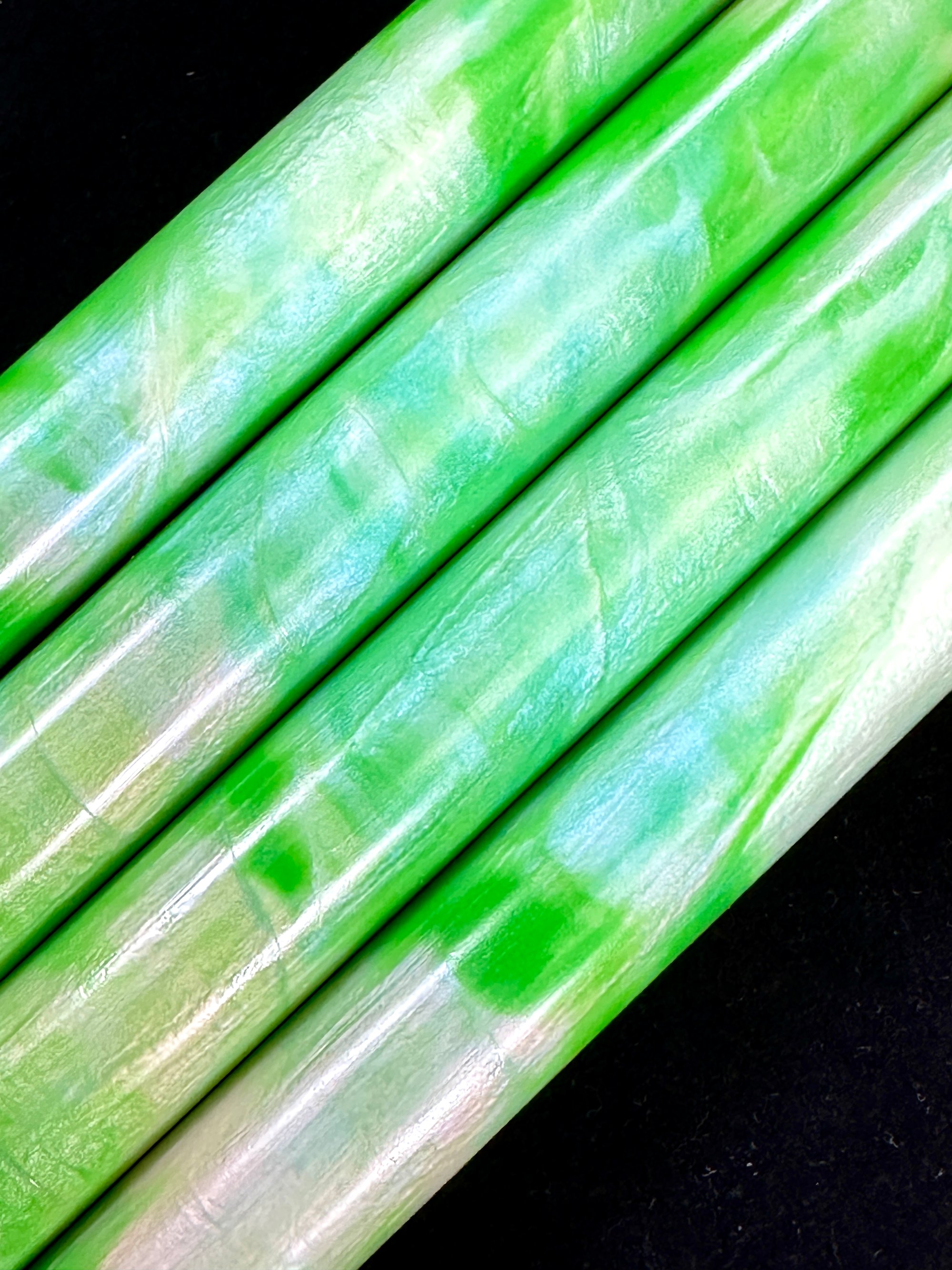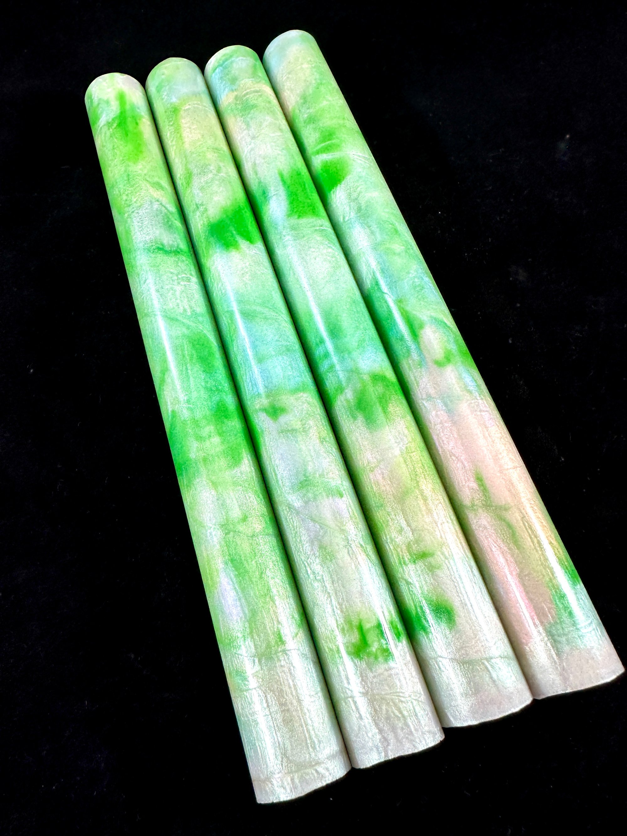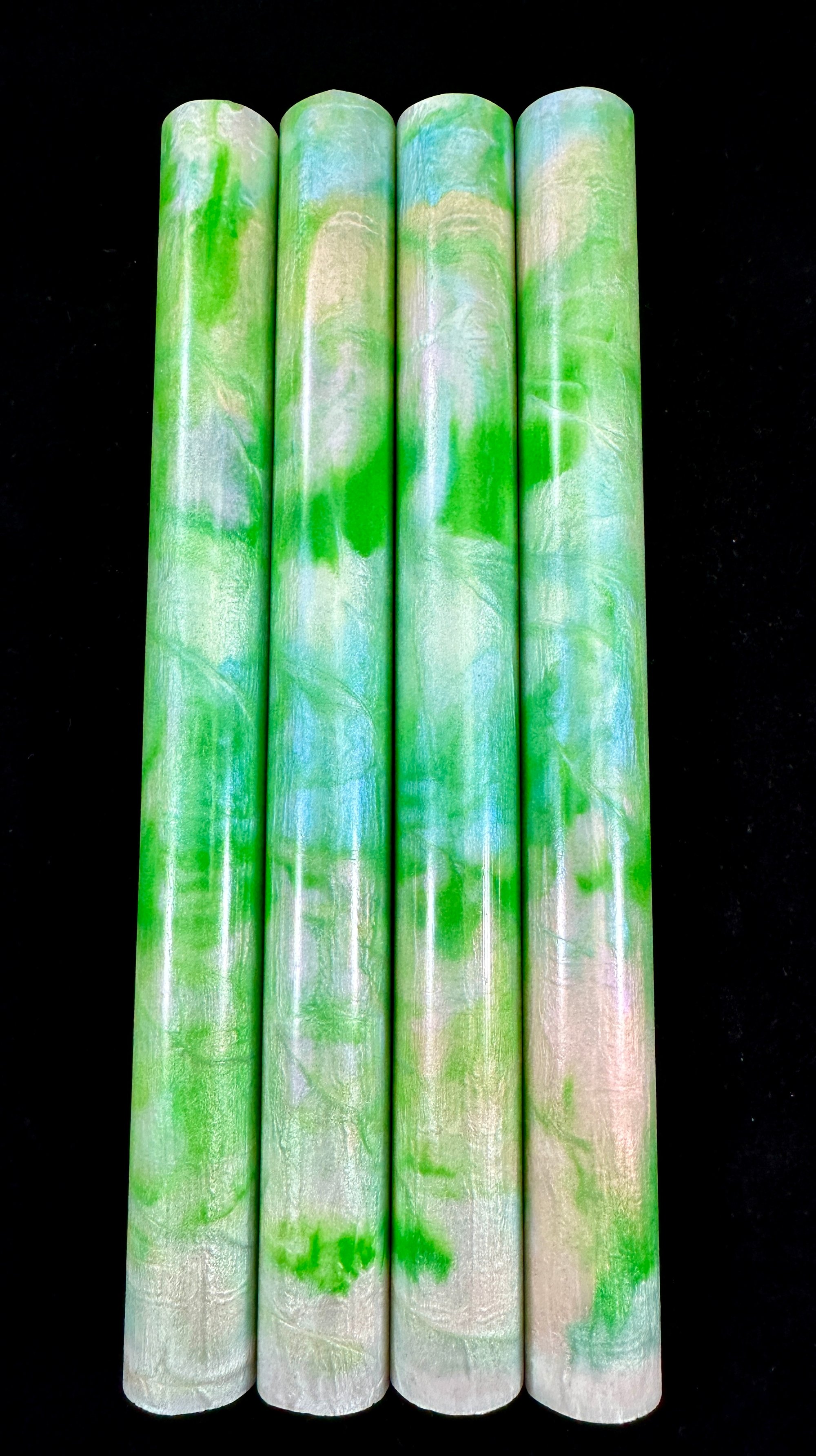 Premium, one of a kind custom bespoke pen blanks. High pressure cast and cured with Alumilite Resin®. 'Green Abalone' is cast using high quality Eye Candy® Pigments, using several shades of ghost powders and green opaque dyes, combined with clear resin resulting in a stunning blank! Made in small batches. These are exclusive, top of the line blanks we offer to custom pen makers. Perfect for the high end fountain pen maker, but would also look fantastic on a kit pen.