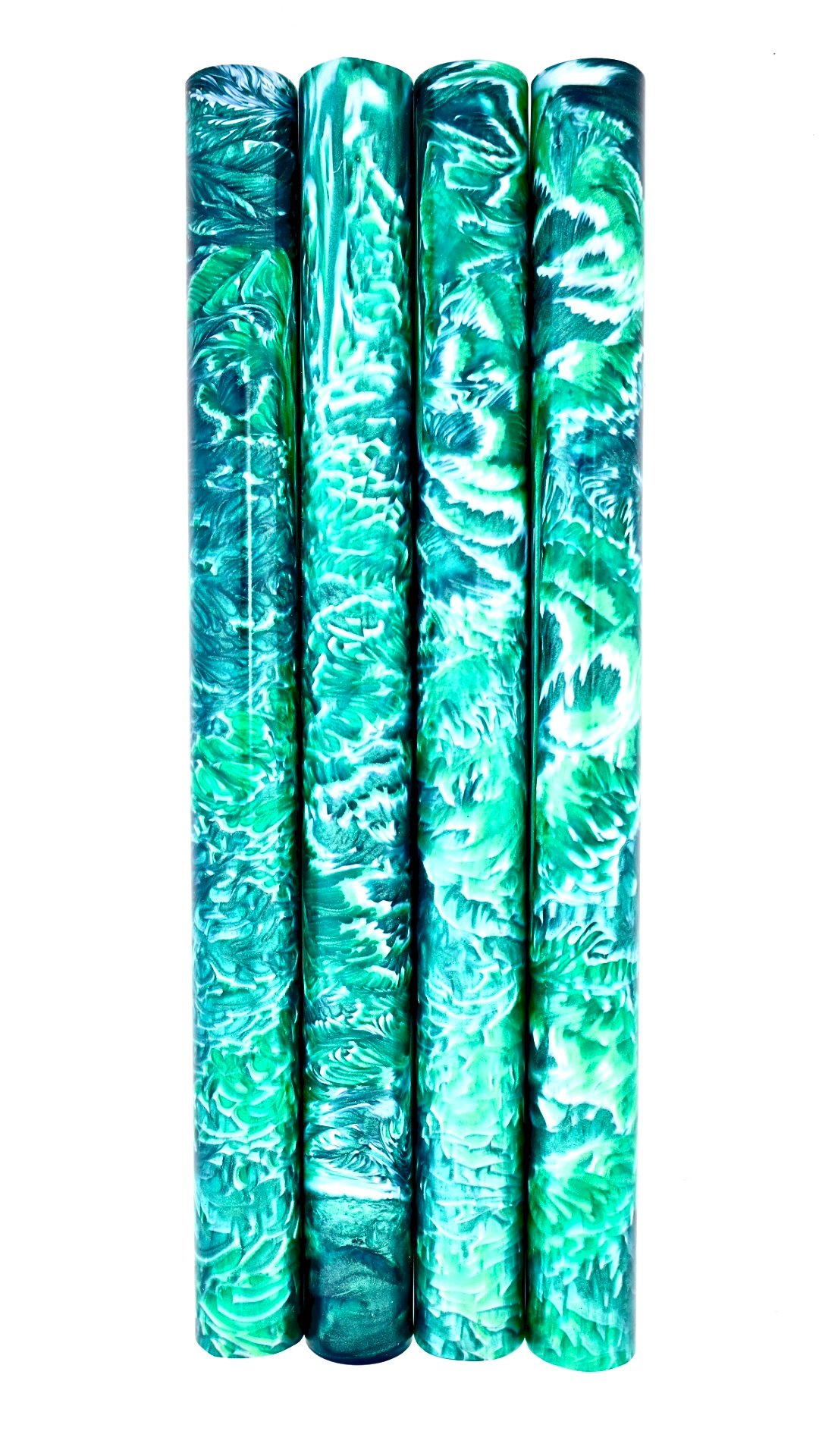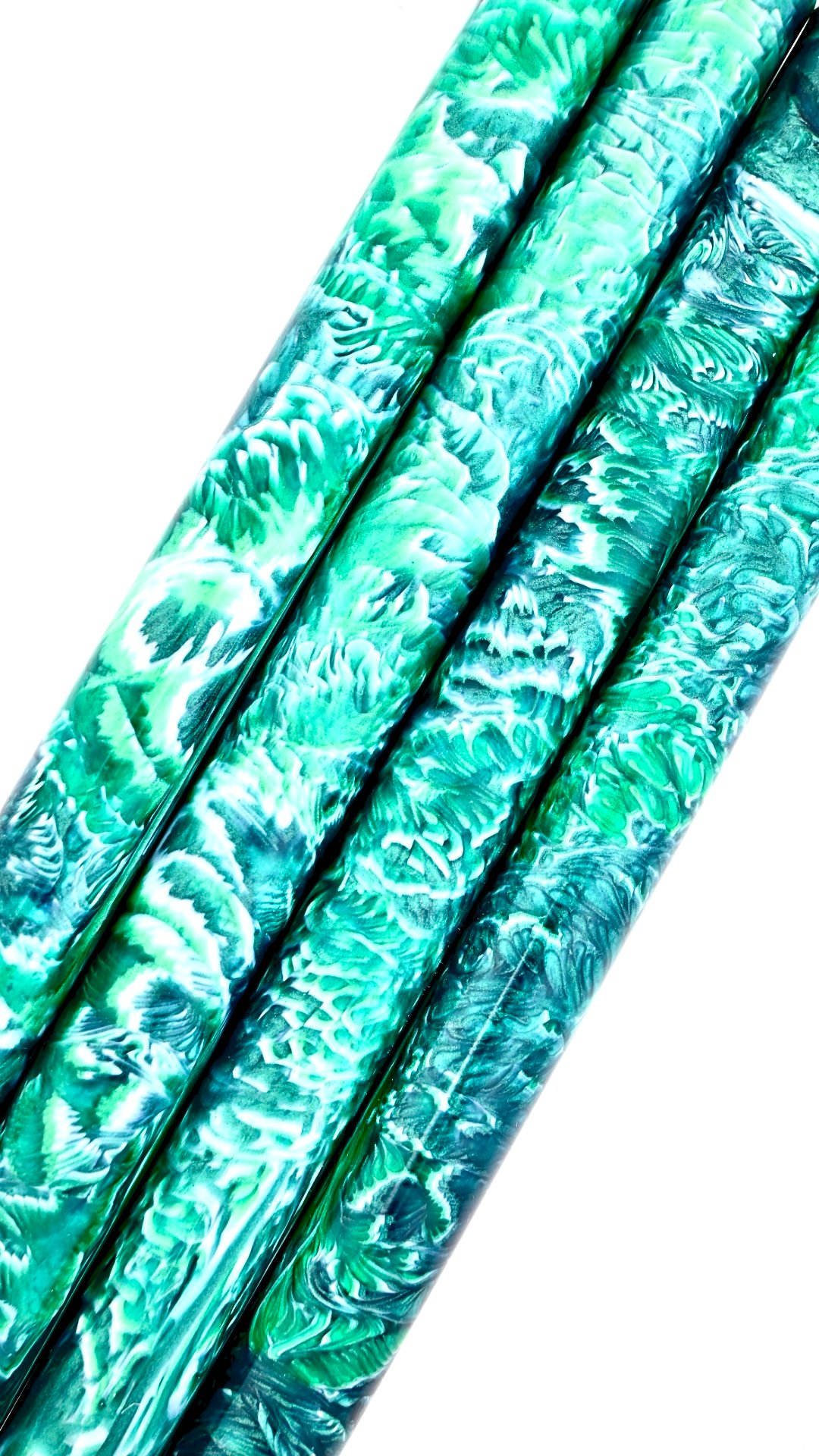 Premium, one of a kind custom bespoke pen blanks. High pressure cast and cured with Alumilite Resin® and unique blends of mica pigments. 'Greener Pastures' includes several shades of green, white & mint green pigments. Cast in small batches and made for custom pen makers in mind, but also taking into consideration other hand-made craft Makers who require one of a kind, high end materials for their craft. This is it!