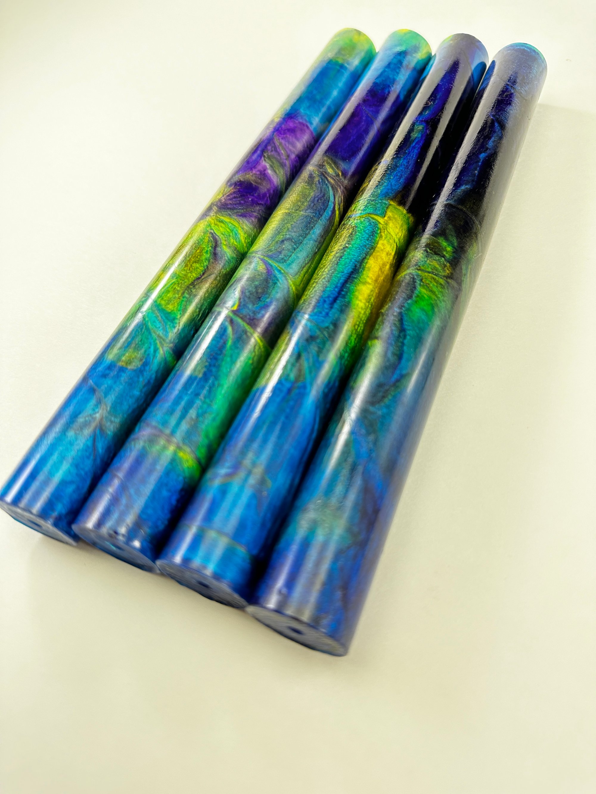 Premium, one of a kind custom bespoke pen blanks. High pressure cast and cured with Alumilite Resin® and unique blends of Eye Candy® mica pigments. 'Galaxy Guardian' is a light bending blank, with several shades of yellow, green, blue and purple running throughout the blank. Made in small batches. These are exclusive, top of the line blanks we offer to custom pen makers. Perfect for the high end fountain pen maker, but would also look fantastic on a kit pen.