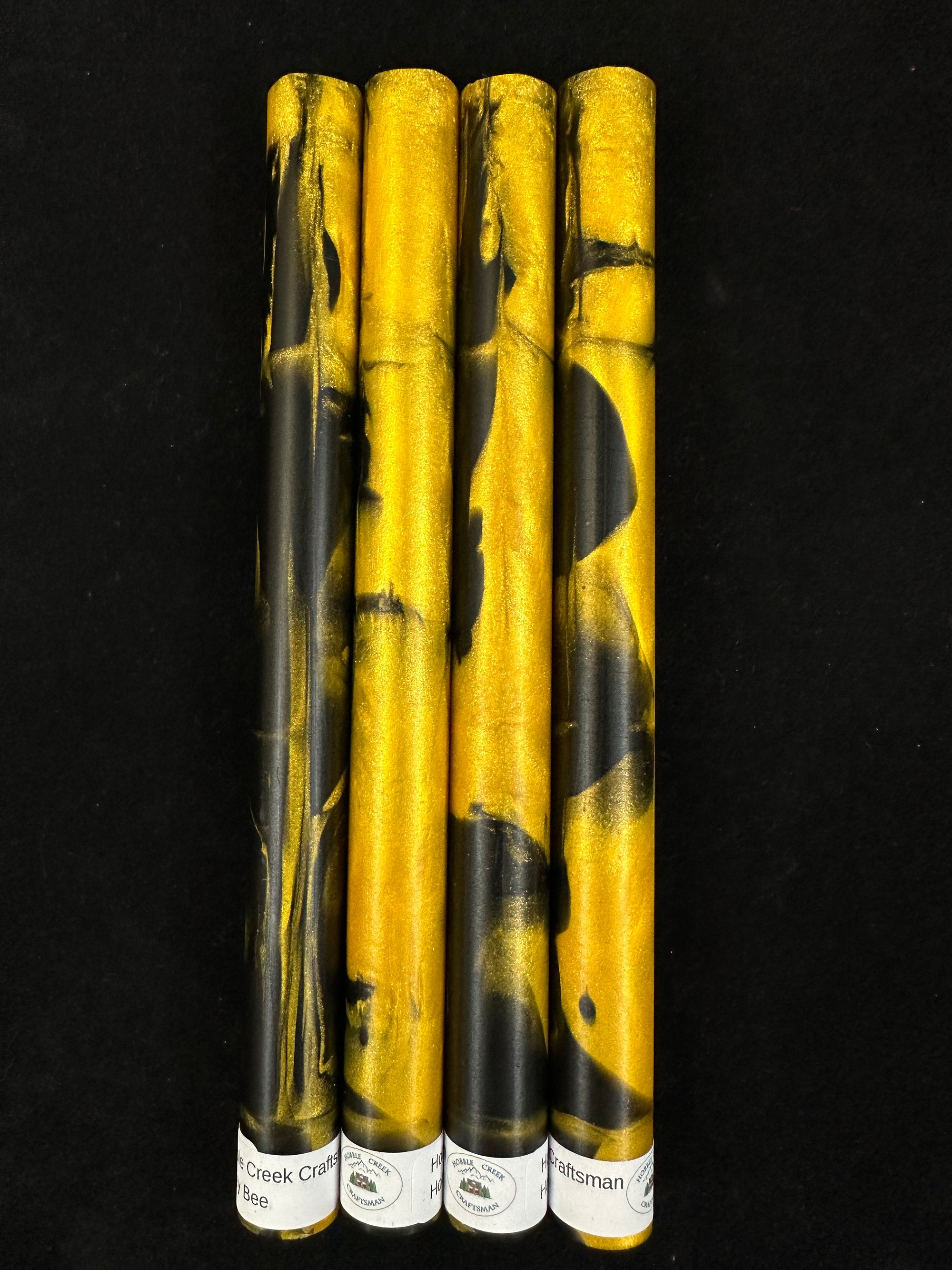 Premium, one of a kind custom bespoke pen blanks. High pressure cast and cured with Alumilite Resin® and unique blends of Eye Candy® mica pigments. 'Honey Bee' includes several shades yellow, gold and black. Made in small batches. These are exclusive, top of the line blanks we offer to custom pen makers. Perfect for the high end fountain pen maker, but would also look fantastic on a kit pen.