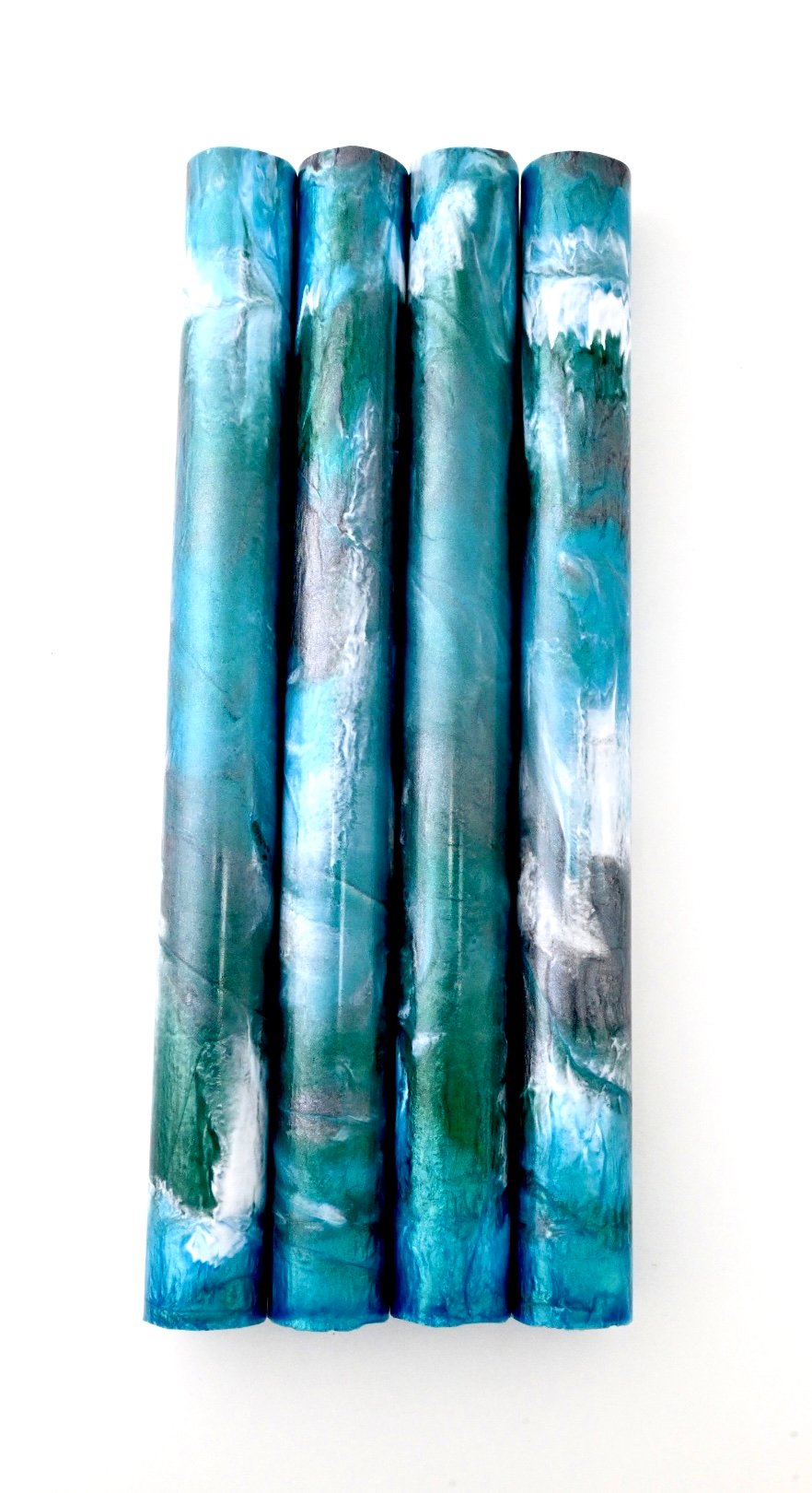 Premium, one of a kind custom bespoke pen blanks. High pressure cast and cured with Alumilite Resin® and unique blends of Eye Candy® mica pigments. 'Kitwanga' colors are hidden inside this beautiful blank and consist of several hues of blue, green and silver/gray. Made in small batches. These are exclusive, top of the line blanks we offer to custom pen makers. Perfect for the high end fountain pen maker, but would also look fantastic on a kit pen.