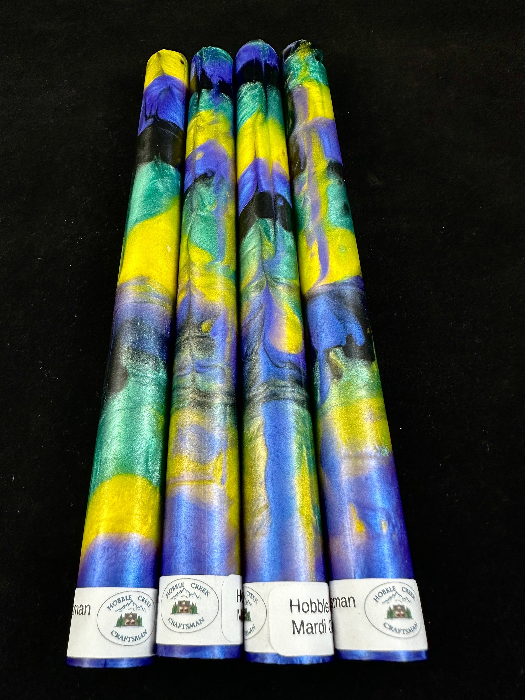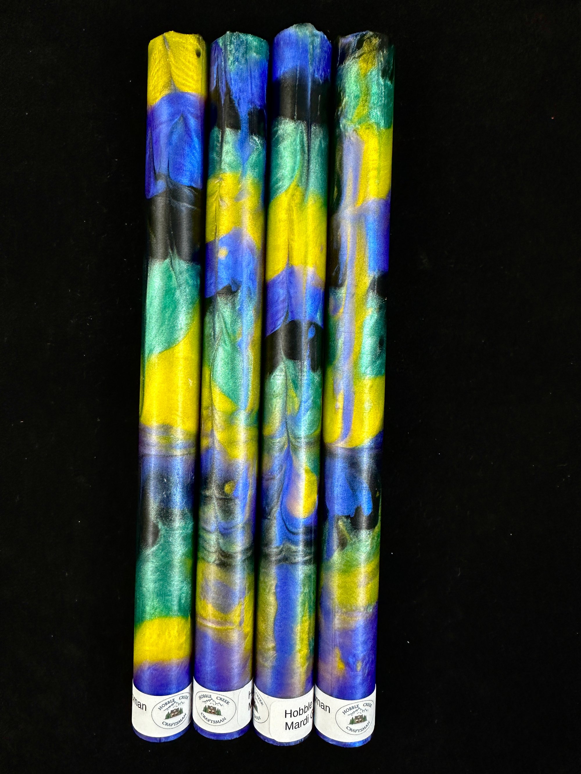 Mardi Gras, custom one of a kind custom bespoke pen blanks. High pressure cast and cured with Alumilite Resin® and unique blends of Eye Candy® mica pigments. 'Mardi Gras includes shades of green, yellow, black and purple. Made in small batches. These are exclusive, top of the line blanks we offer to custom pen makers. Perfect for the high end fountain pen maker, but would also look fantastic on a kit pen.