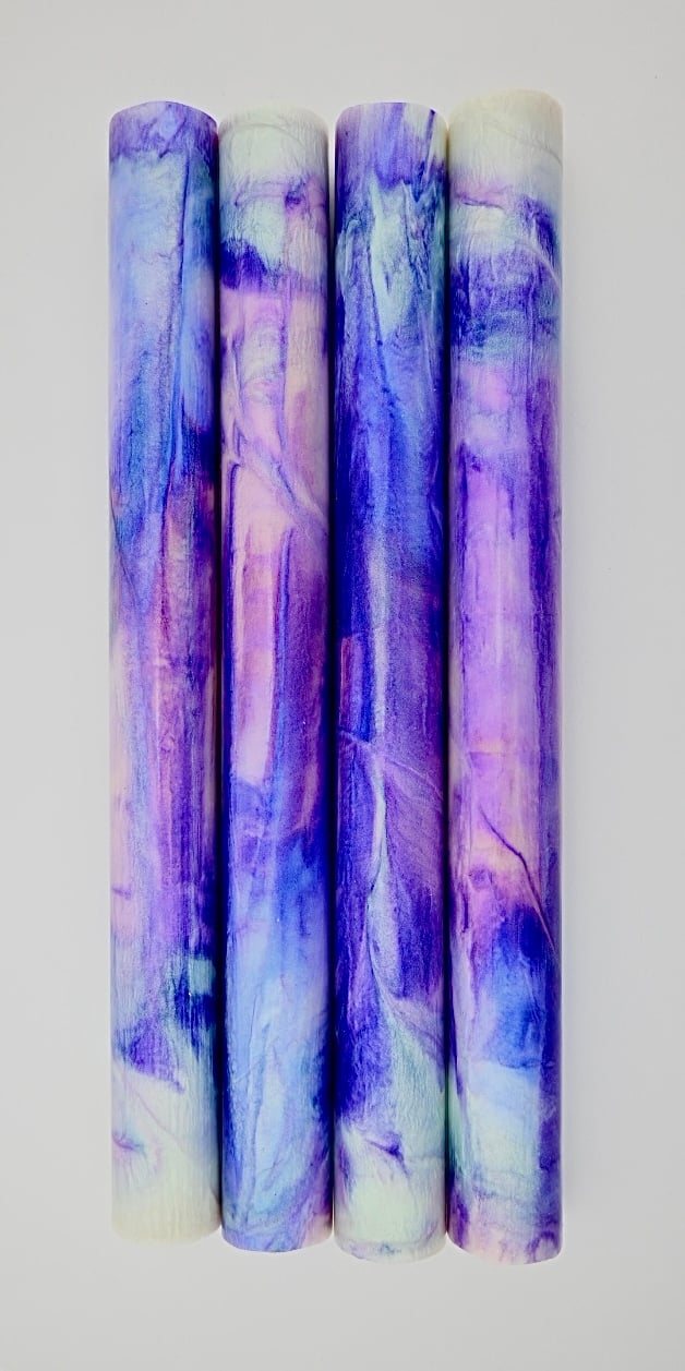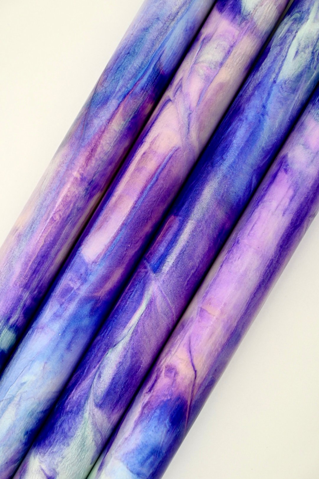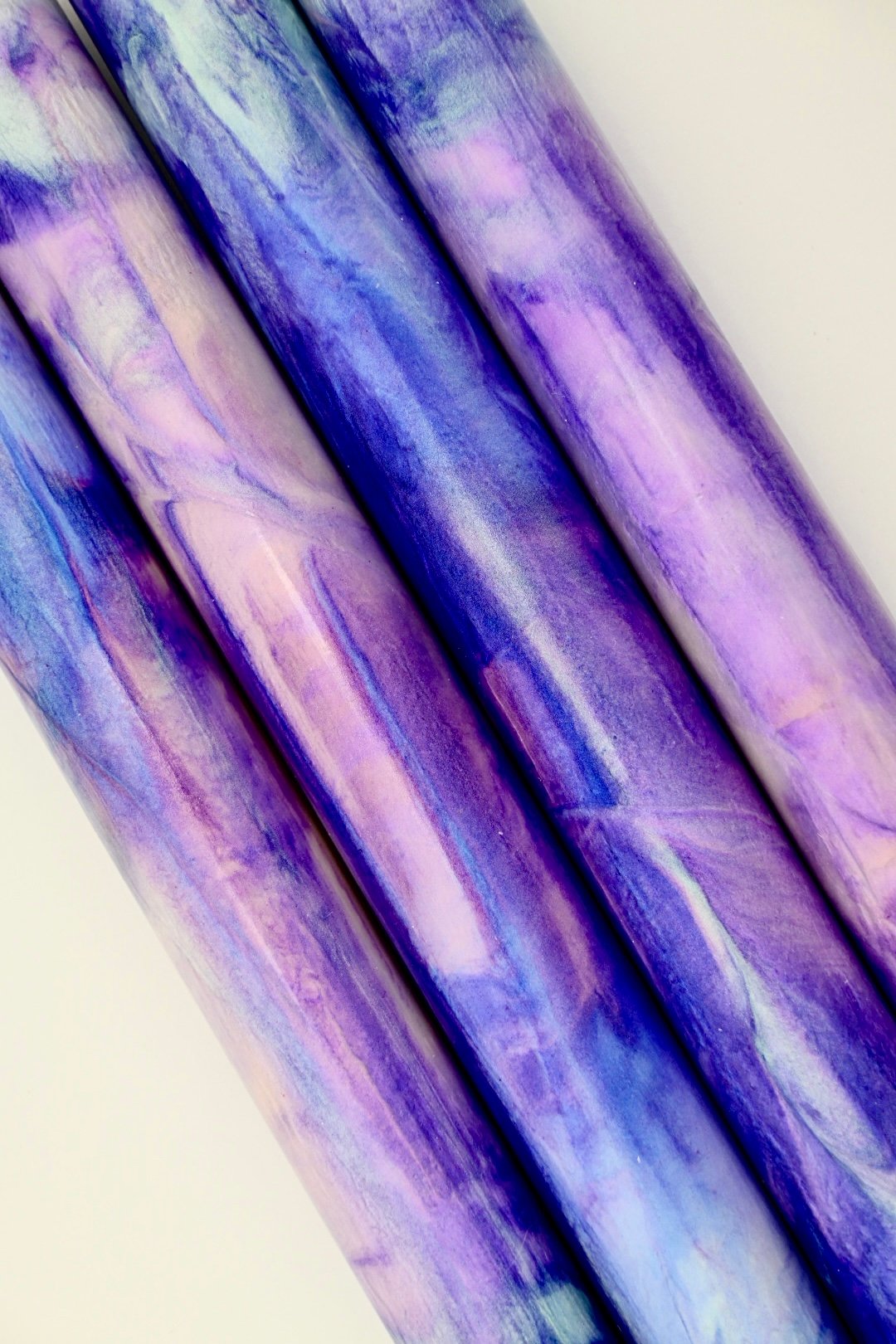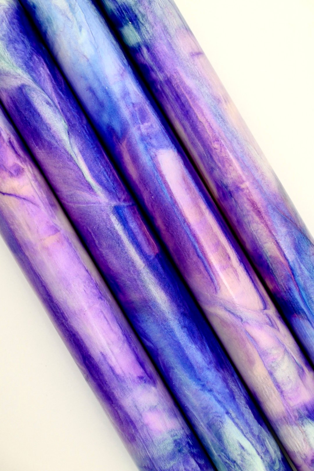 Premium, one of a kind custom bespoke pen blanks. High pressure cast and cured with Alumilite Resin® and unique blends of Eye Candy® mica pigments. 'Purple Abalone' is a beautiful blank with color-shifting red, blue, green and purple running throughout the blank, with plumb purple accent streaks. Made in small batches. These are exclusive, top of the line blanks we offer to custom pen makers. Perfect for the high end fountain pen maker, but would also look fantastic on a kit pen.