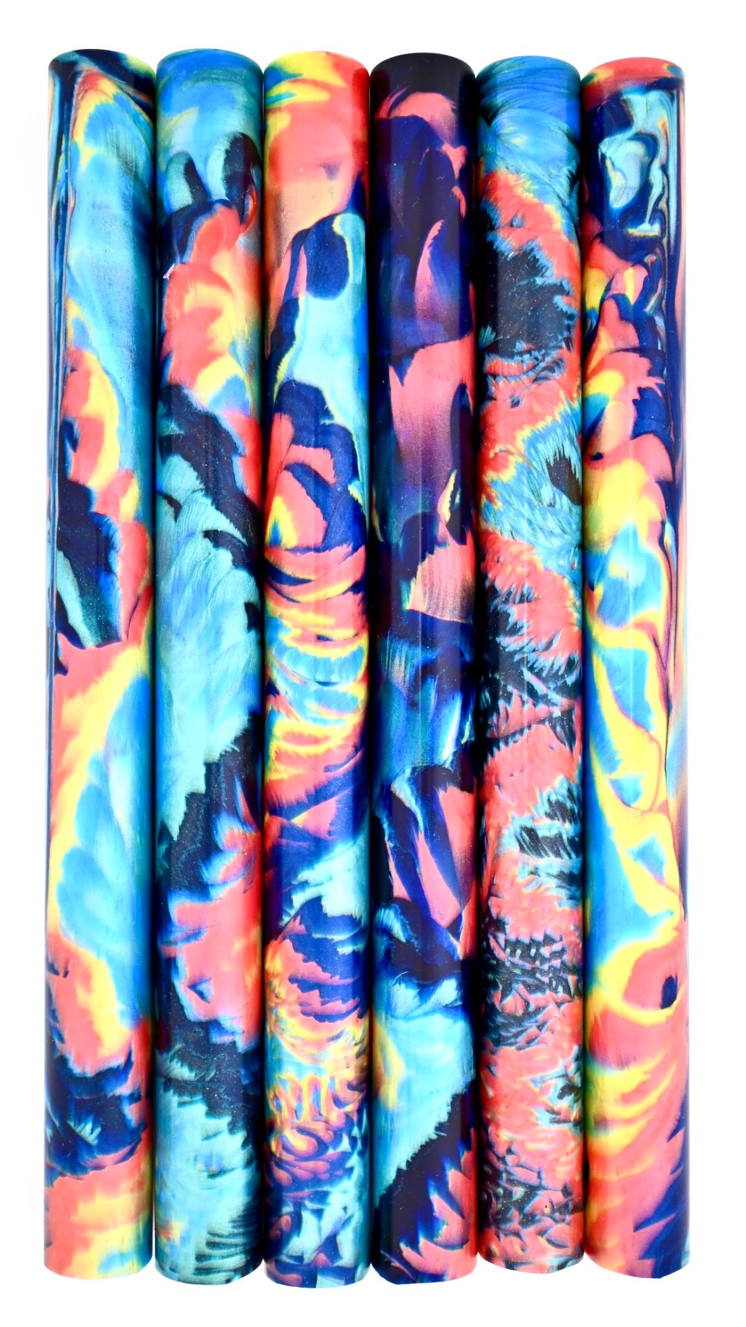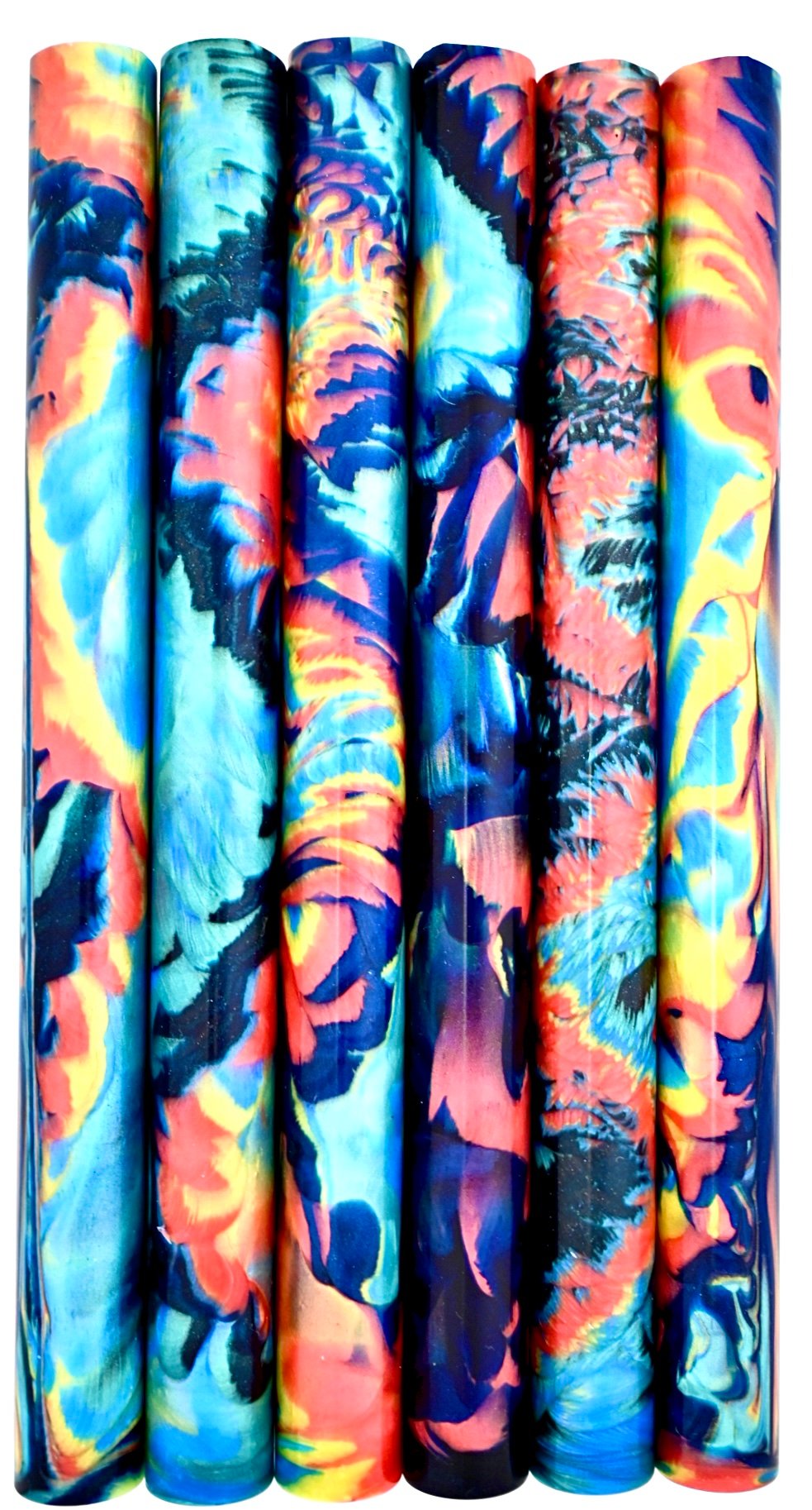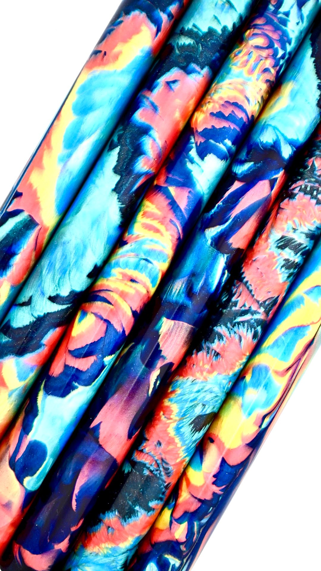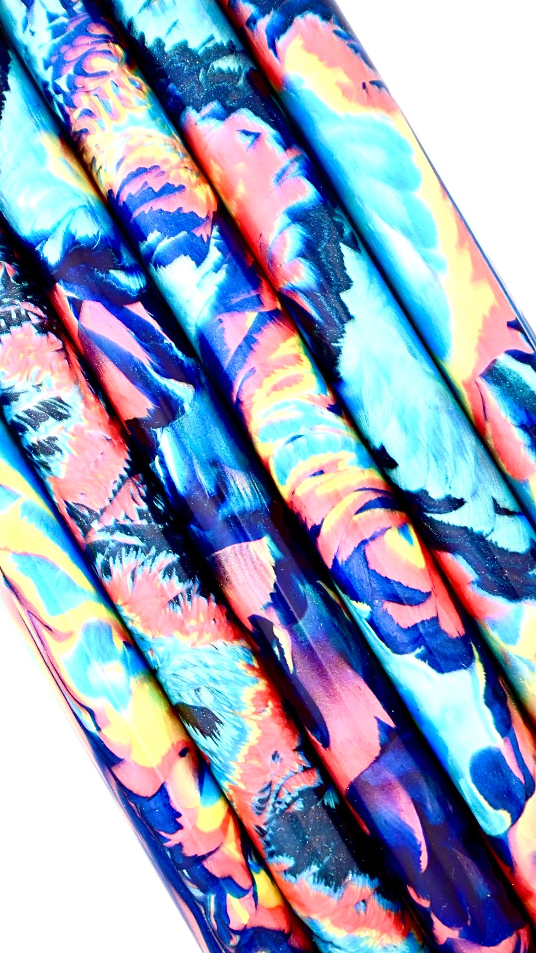 Premium, one of a kind custom bespoke pen blanks. High pressure cast and cured with Alumilite Resin® and unique blends of Eye Candy® mica pigments. 'Rainbow In The Dark' is a beautiful blank with shimmering turquoise, violet, yellows and pinks running randomly throughout the blank, highlighted by thin ribbons of black & dark blue with tiny rainbow crystals. Made in small batches. These are high end Maker's blanks, perfect for custom fountain pen Makers or any Maker of fine custom crafts looking for unique, one of a kind materials.