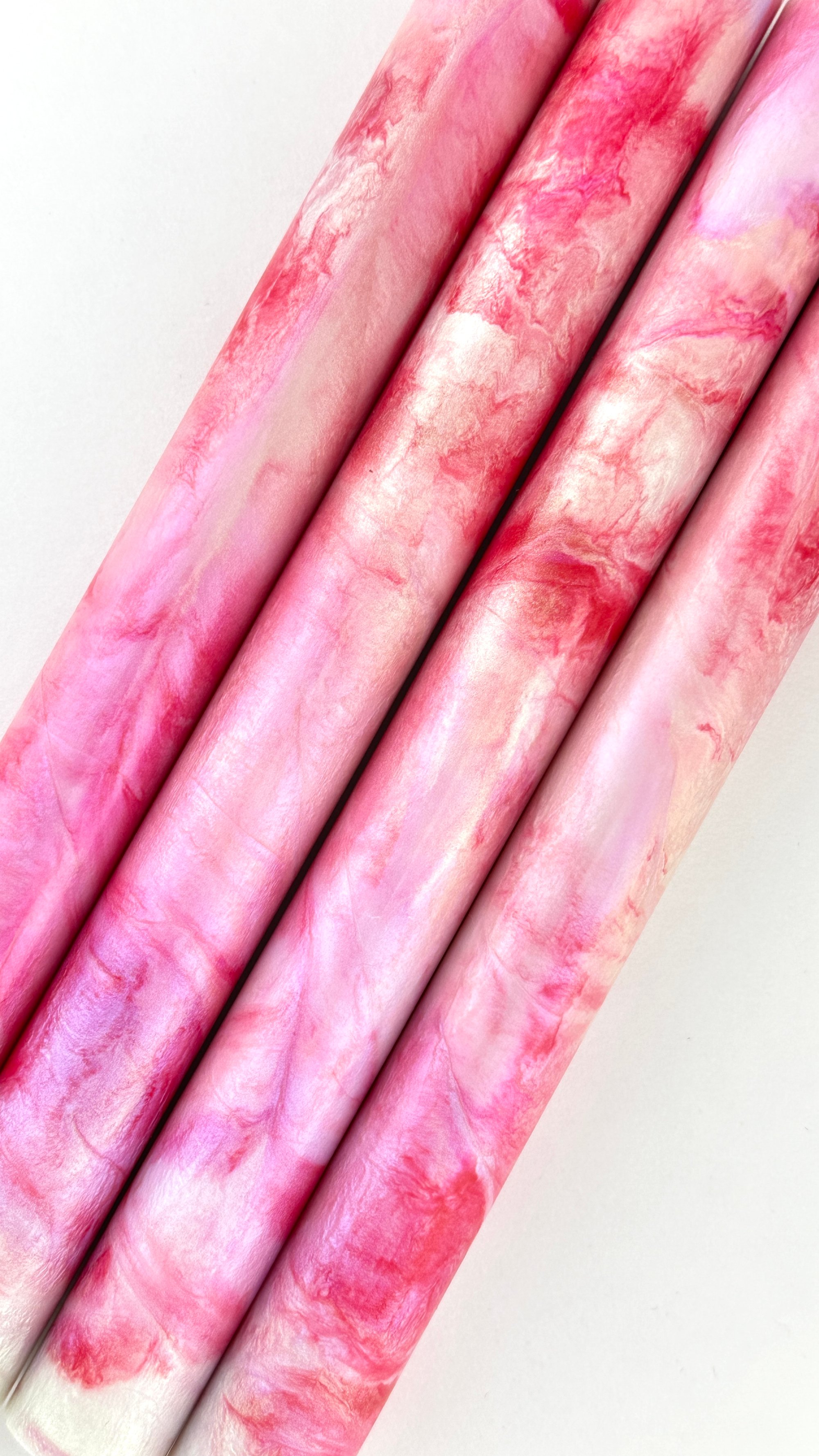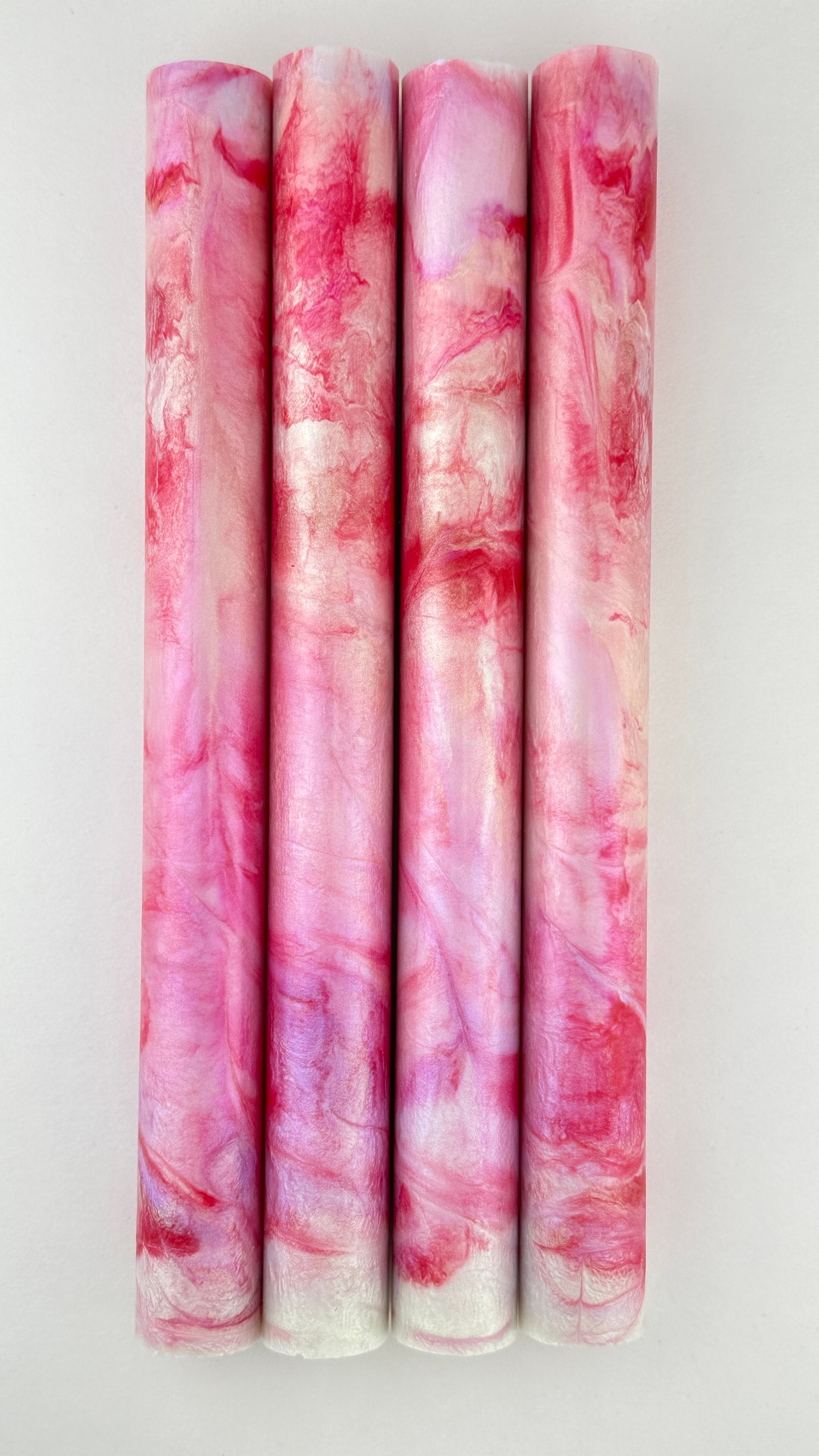 Premium, one of a kind custom bespoke pen blanks. High pressure cast and cured with Alumilite Resin® and unique blends of Eye Candy® mica pigments. 'Red Abalone' is a beautiful blank with color-shifting red, blue, green and purple running throughout the blank, with berry red accent streaks. Made in small batches. These are exclusive, top of the line blanks we offer to custom pen makers. Perfect for the high end fountain pen maker, but would also look fantastic on a kit pen.