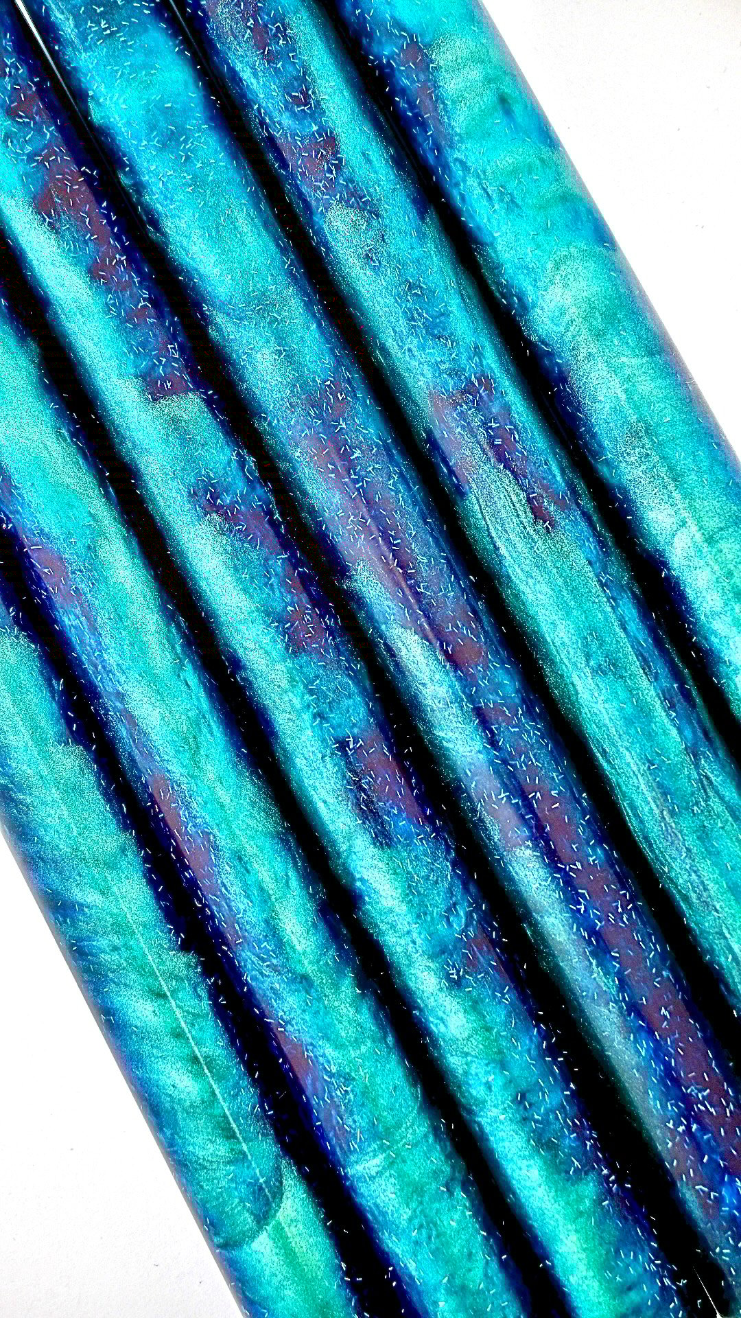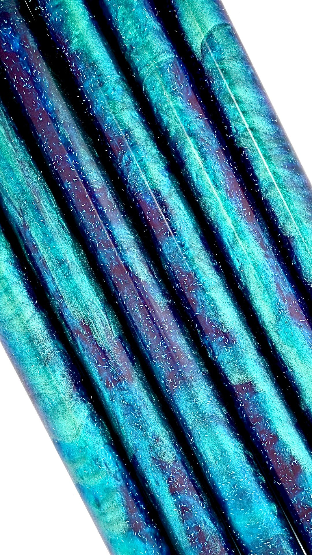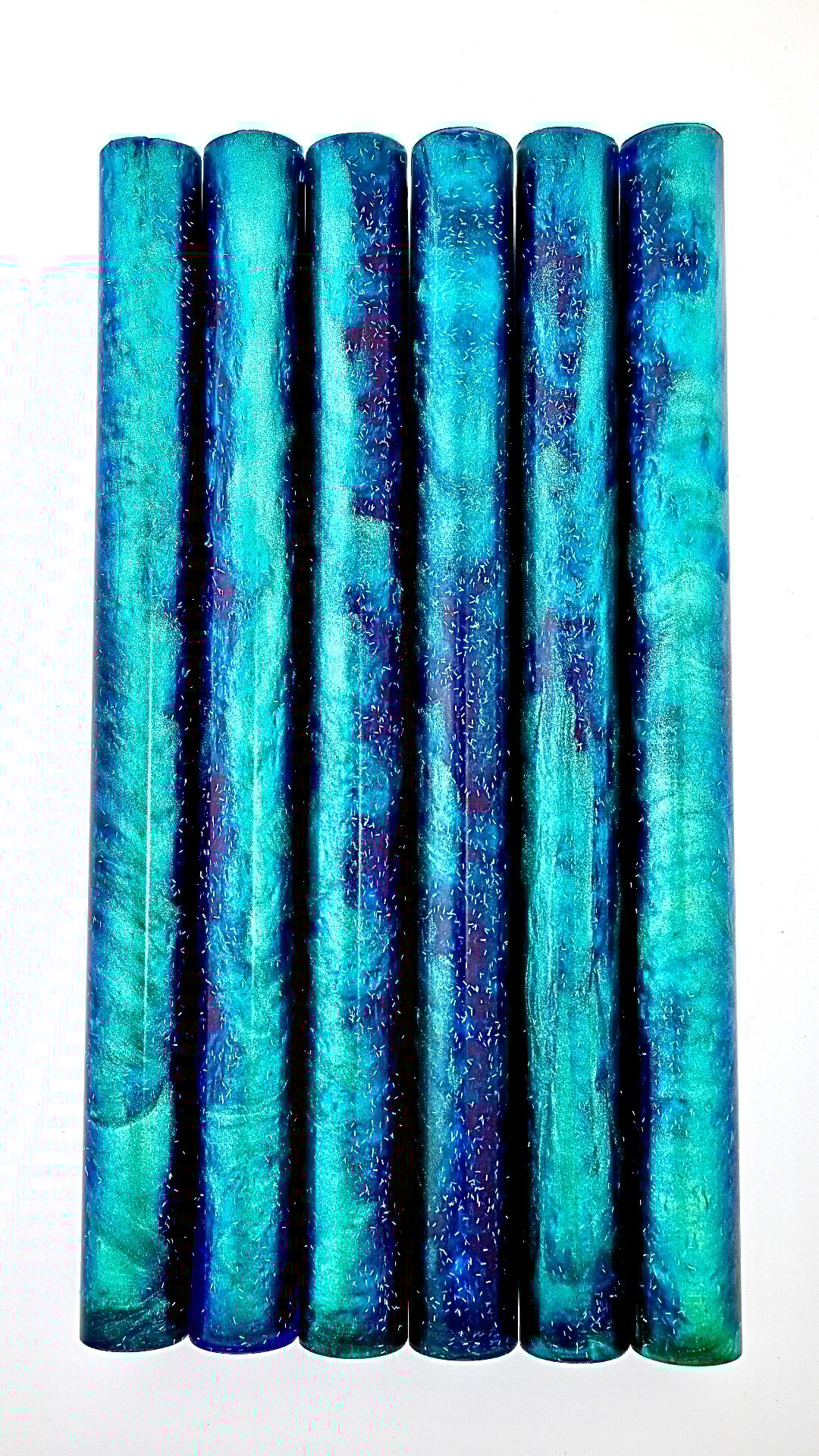 Premium, one of a kind custom bespoke Maker's blanks. High pressure cast and cured with Alumilite Resin®, 'Run Silent, Run Deep' is a unique blank with blends of translucent ocean blue, highly chatoyant green and shredded holographic glitter running throughout. Made in small batches. These are exclusive, top of the line blanks we offer to custom pen makers or any maker looking for unique material.