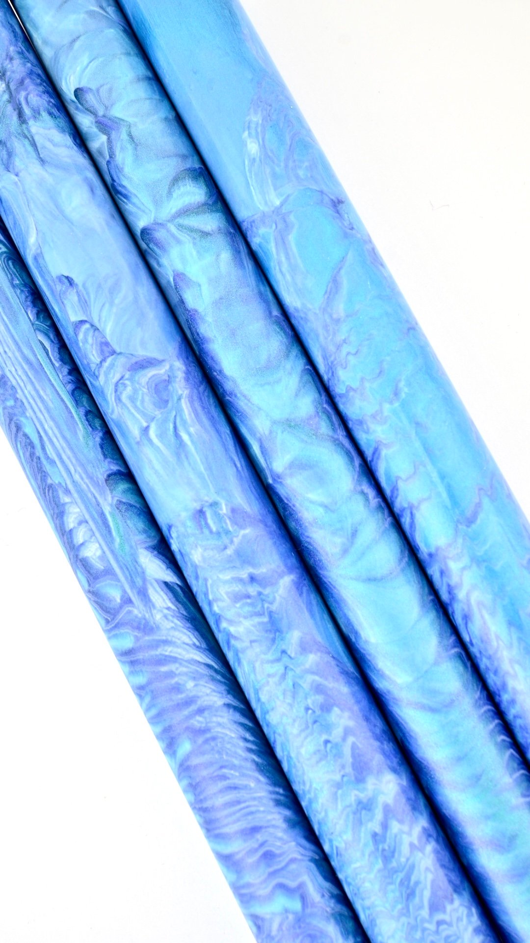 New, Custom Bespoke Makers Blank! 'Time Warp' is high pressure cast using Alumilite resin, translucent dyes and proprietary color-shift pigments along with several shades of blue, turquoise and white. It will definitely hold some beautiful surprises! Made for high end custom fountain pen makers in mind, but also taking into consideration other custom makers who require one of a kind, high end materials for their craft. This is it!