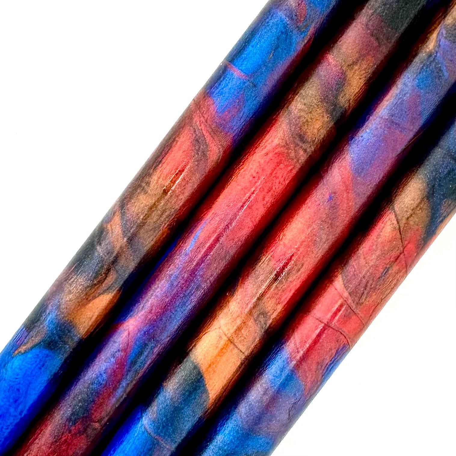 Premium, one of a kind custom bespoke pen blanks. High pressure cast and cured with Alumilite Resin®. 'Zyphyr Cove' is cast with high quality Eye Candy Pigments®, including several shades of blue, flame orange and deep red, mixed with clear resin, resulting in a stunning blank! Made in small batches. These are exclusive, top of the line blanks we offer to custom pen makers. Perfect for the high end fountain pen maker.